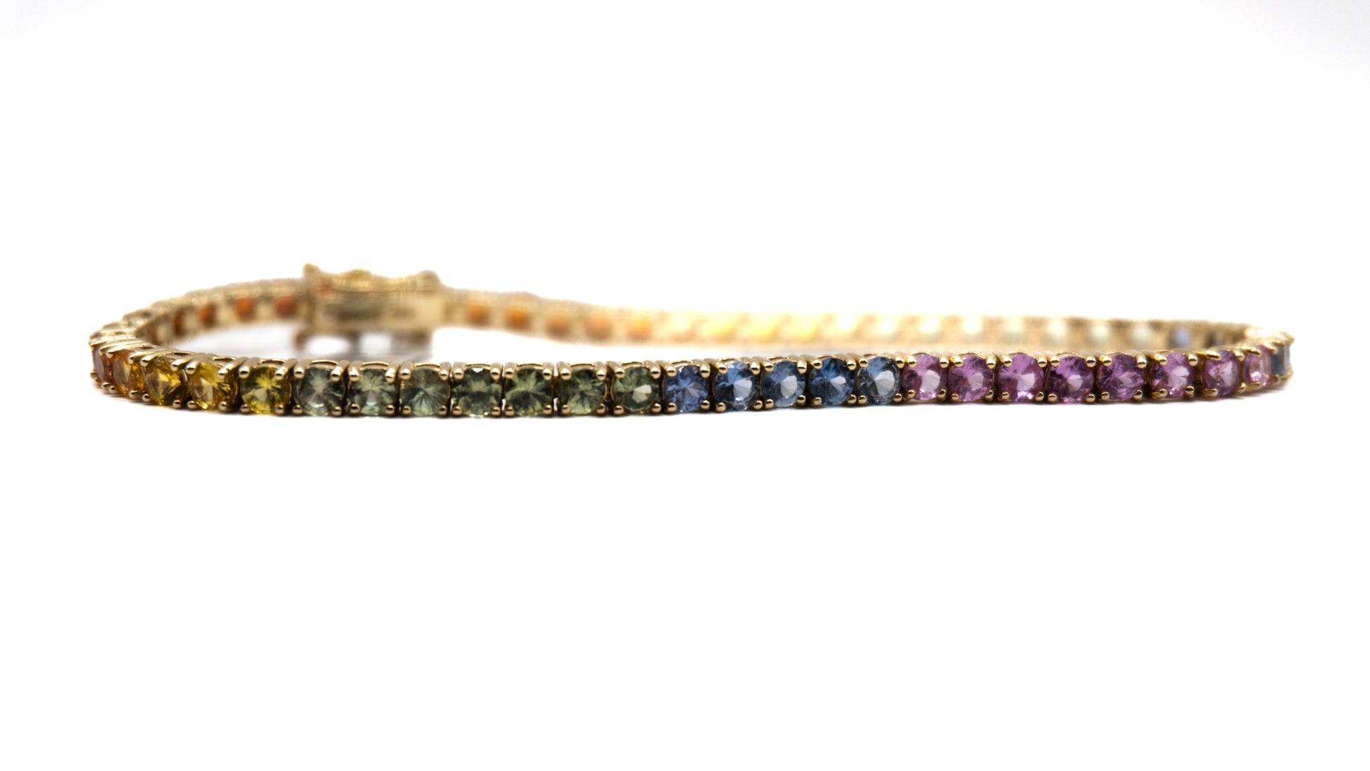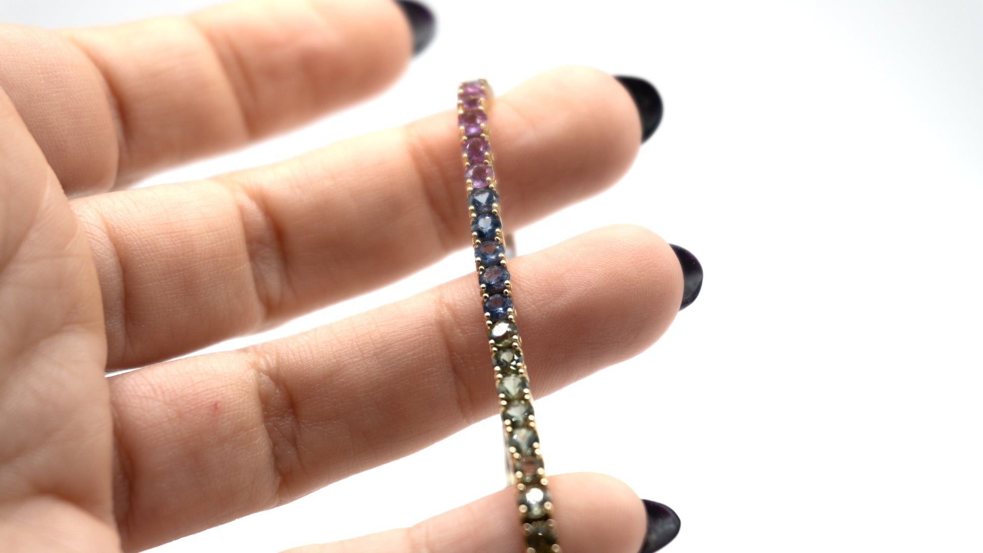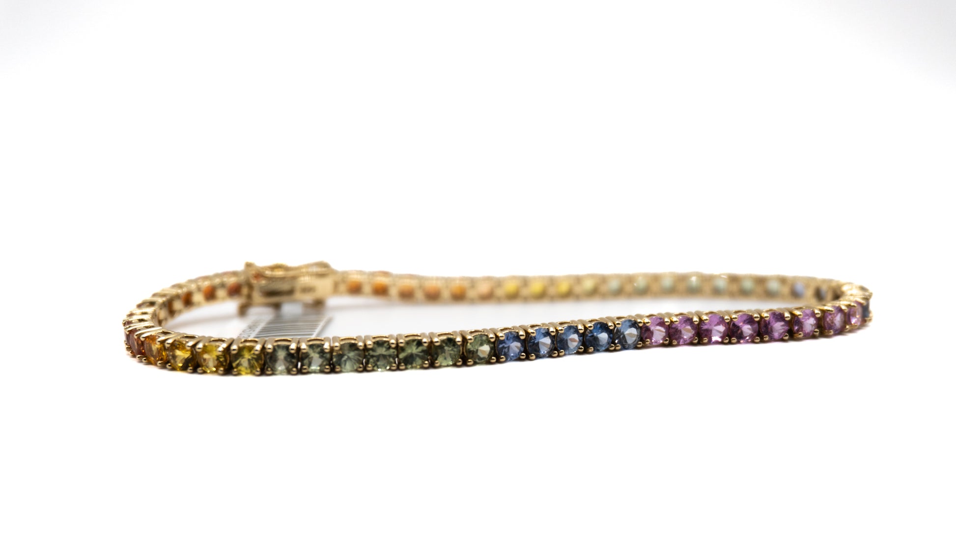 A vibrant spectrum of elegance. This 14k gold tennis bracelet features a seamless gradient of rainbow sapphires, offering a bold yet refined pop of color. A joyful twist on a timeless classic—perfect for stacking or standing alone.