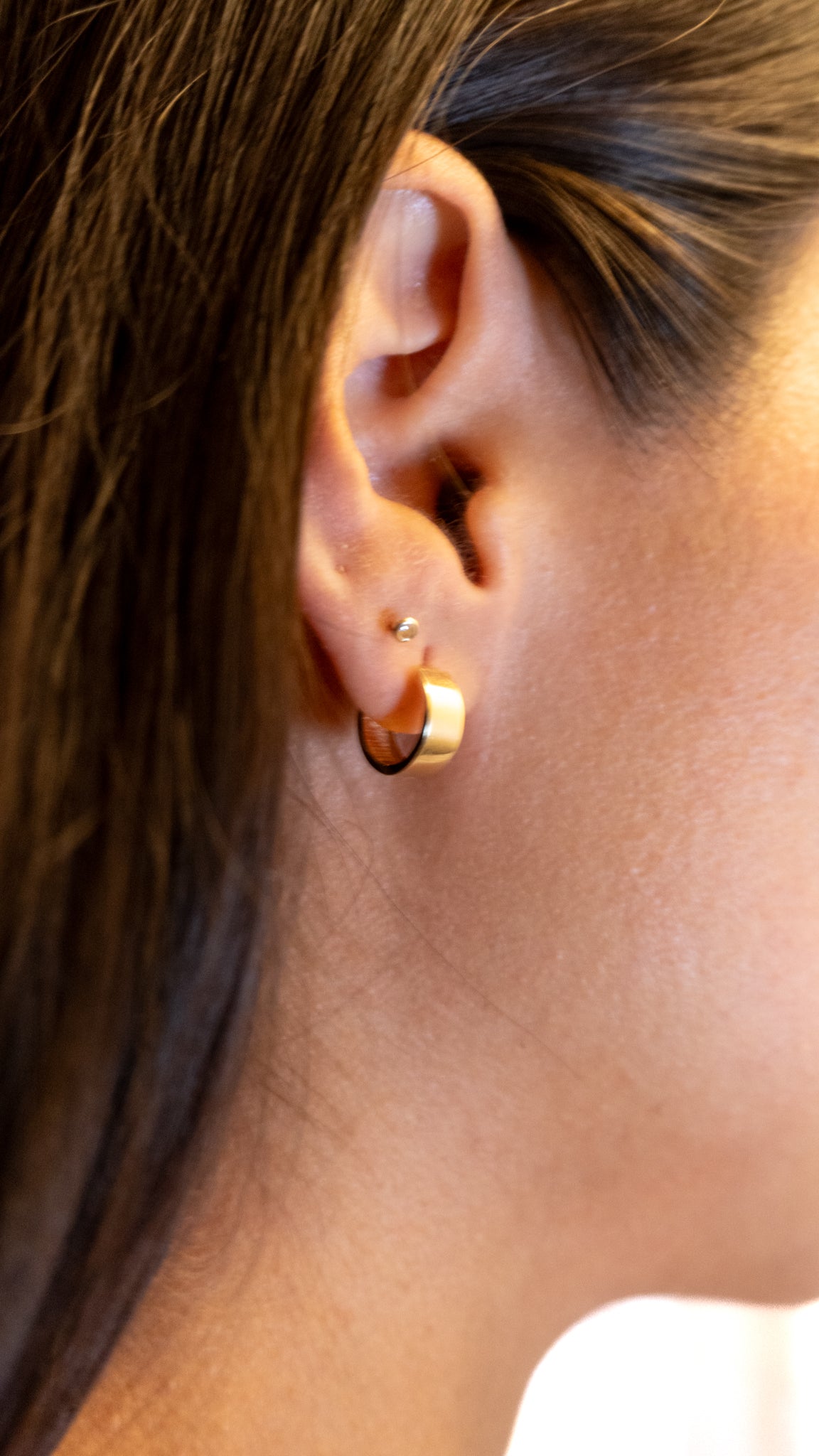 Small in size, big on shine. These 14k gold mini hoops feature a thick, polished design for a sleek and modern look. Perfect for everyday wear or stacking with your favorite earrings.