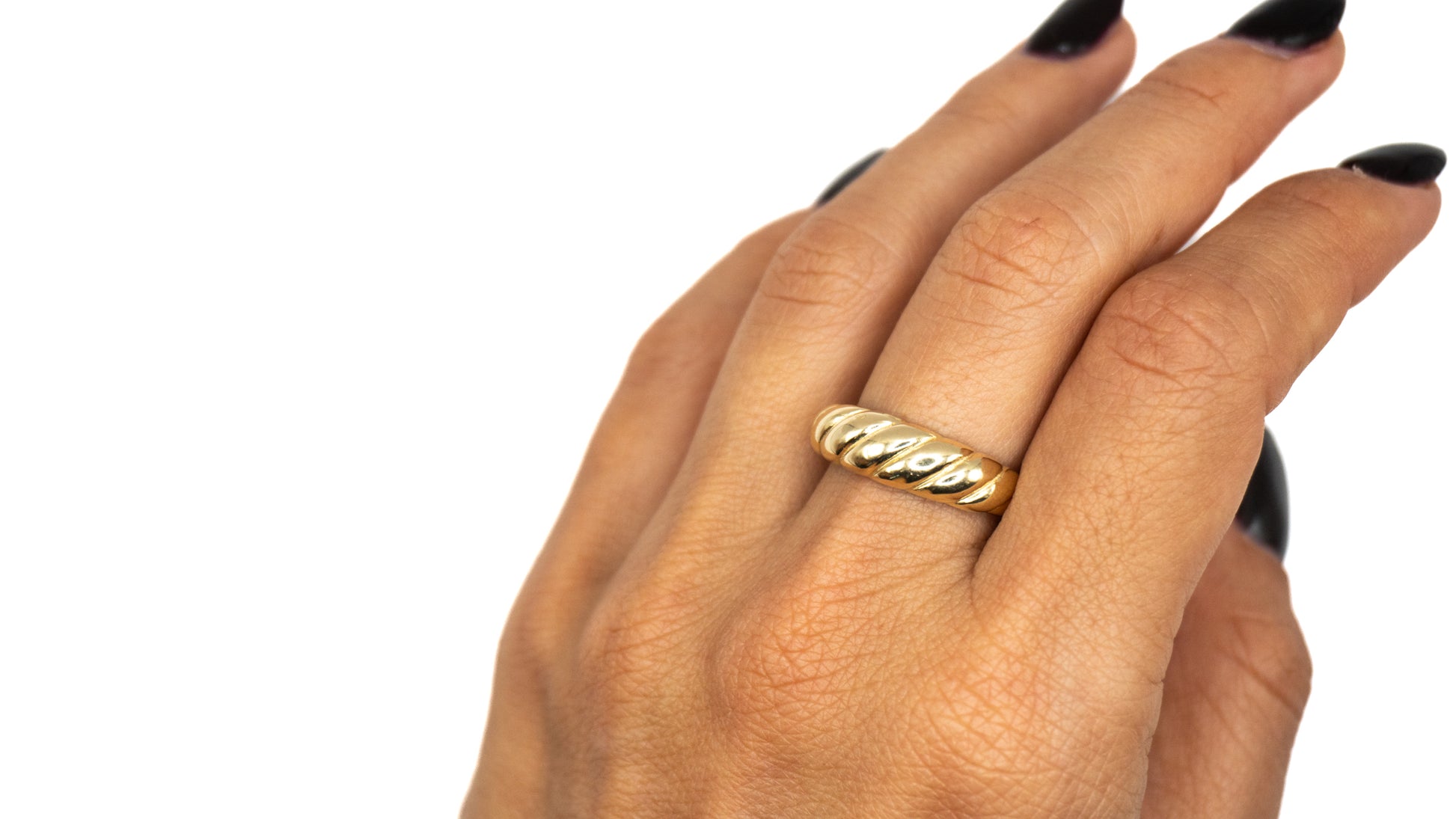 A dainty twist on a classic favorite. This 14k gold ring features a petite croissant-inspired design, perfect for stacking or wearing solo for a touch of effortless elegance.