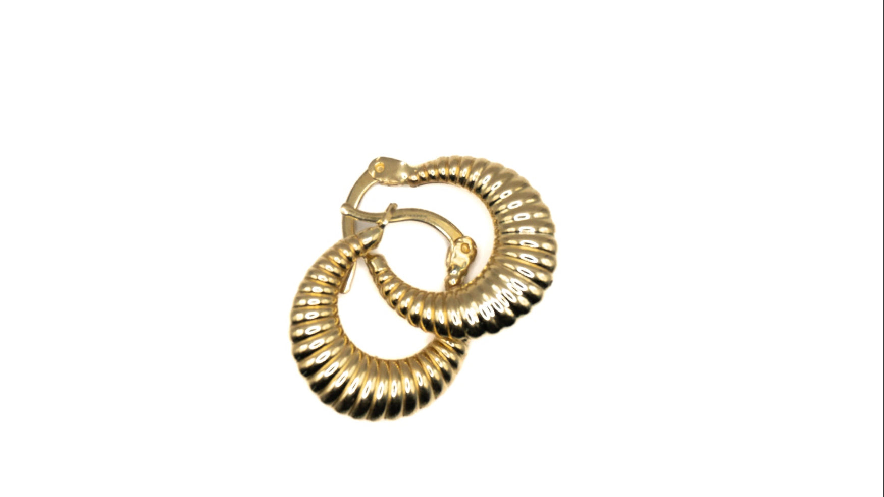 These 14k gold mini hoops blend vintage charm with modern texture. Featuring a ridged, croissant-like design, they’re the perfect everyday pair.