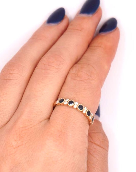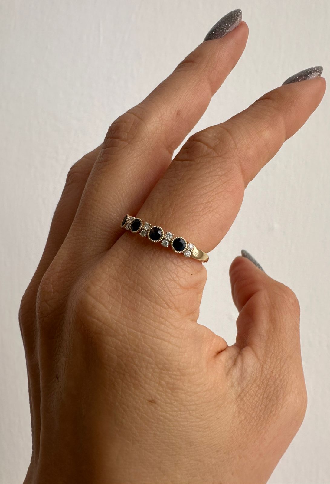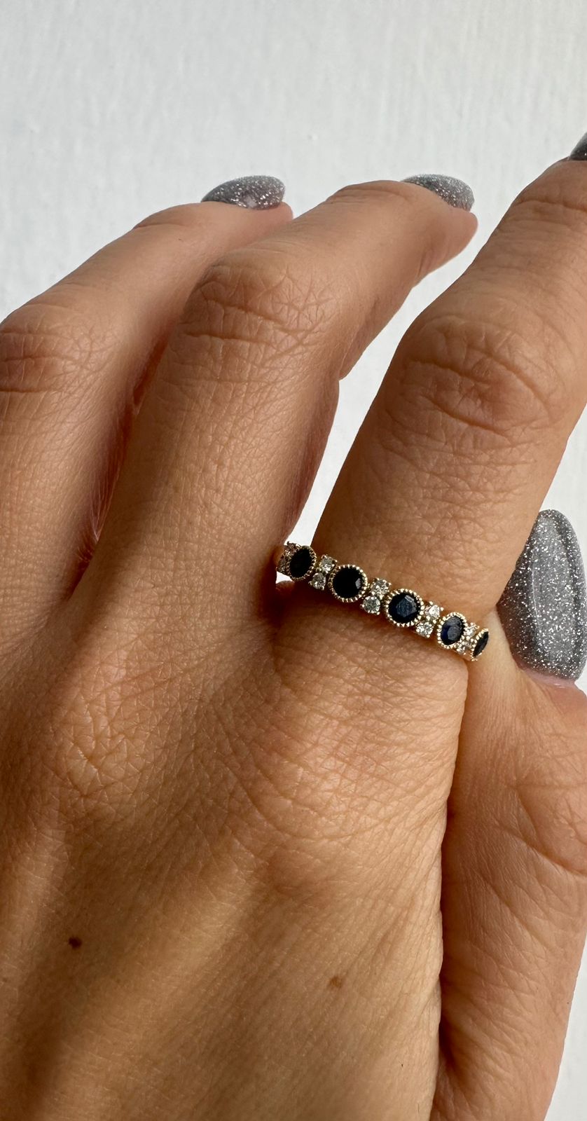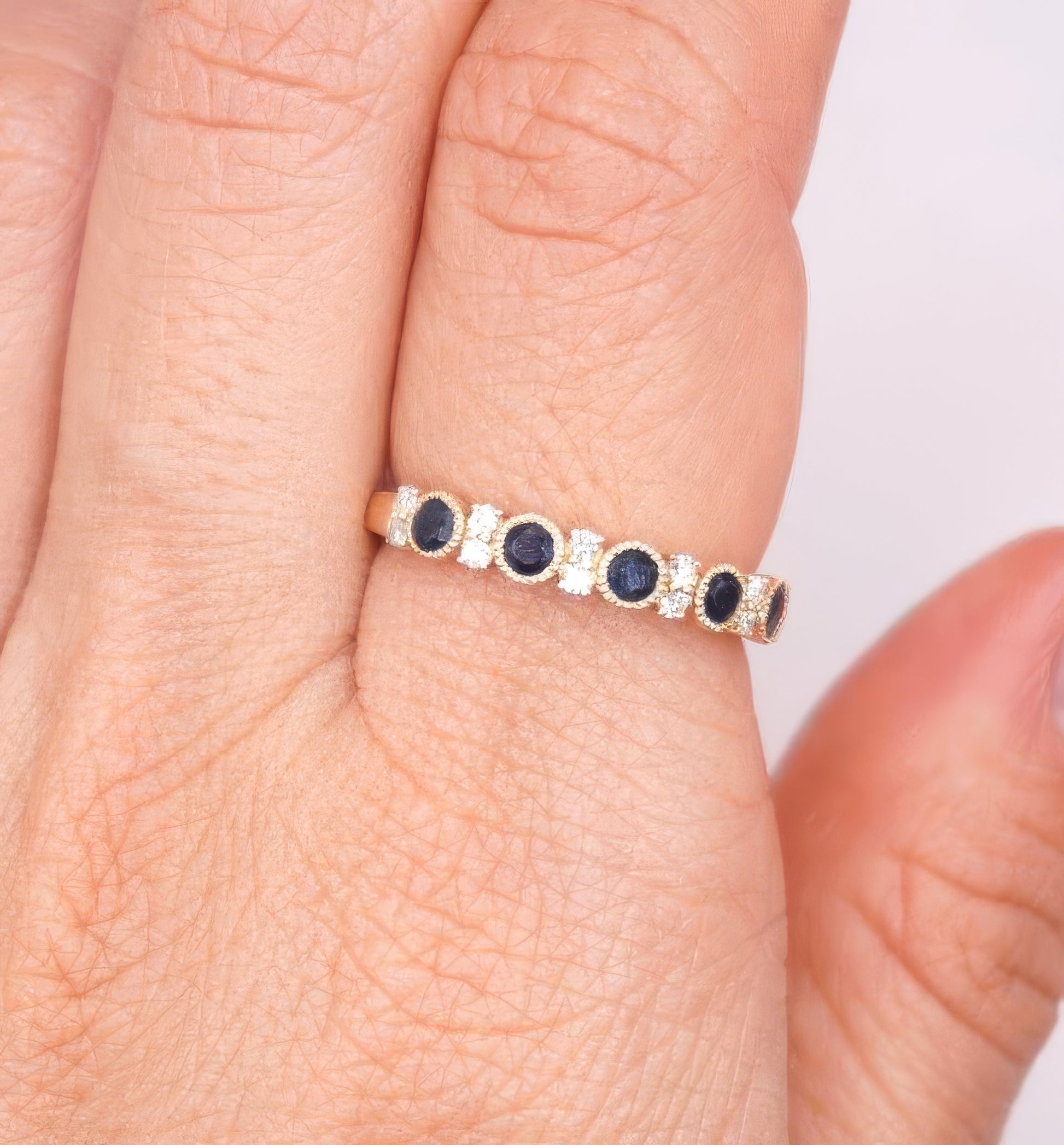 A timeless 14k gold band adorned with 0.40 ct deep blue sapphires framed by delicate 0.16 diamond-cut details. Its crown-like silhouette creates a soft shimmer with every movement — a perfect stacking piece that adds richness, elegance, and a touch of midnight magic to any ring collection.