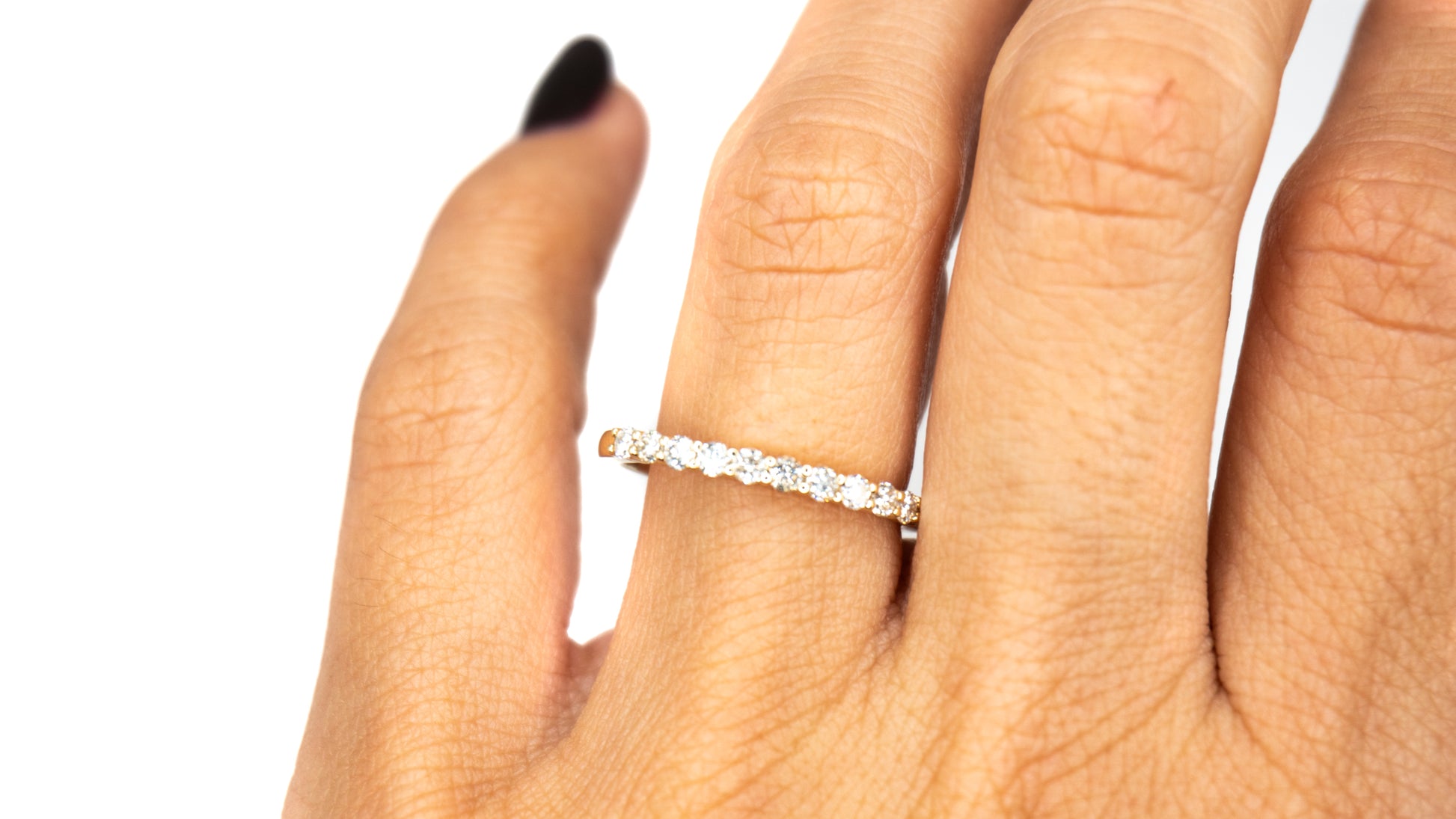 A timeless sparkle in every detail. This 14k gold band features brilliant round diamonds, designed for stacking or wearing solo. Delicate yet radiant—perfect for elevating your everyday.