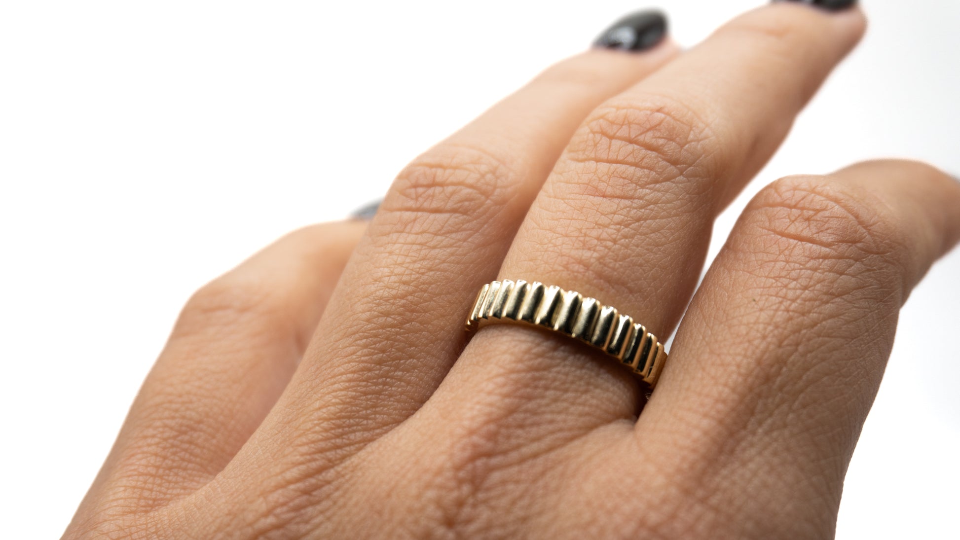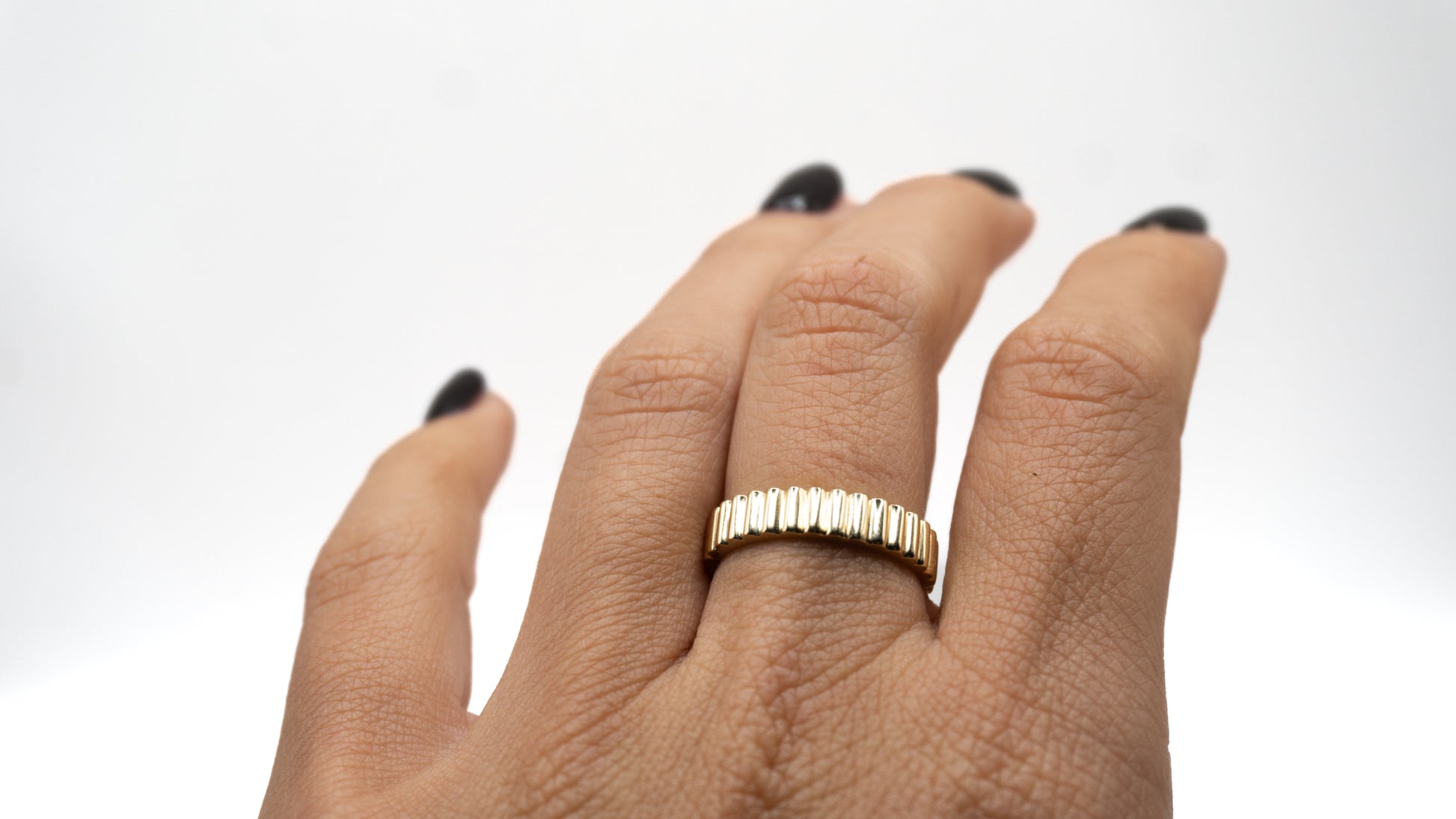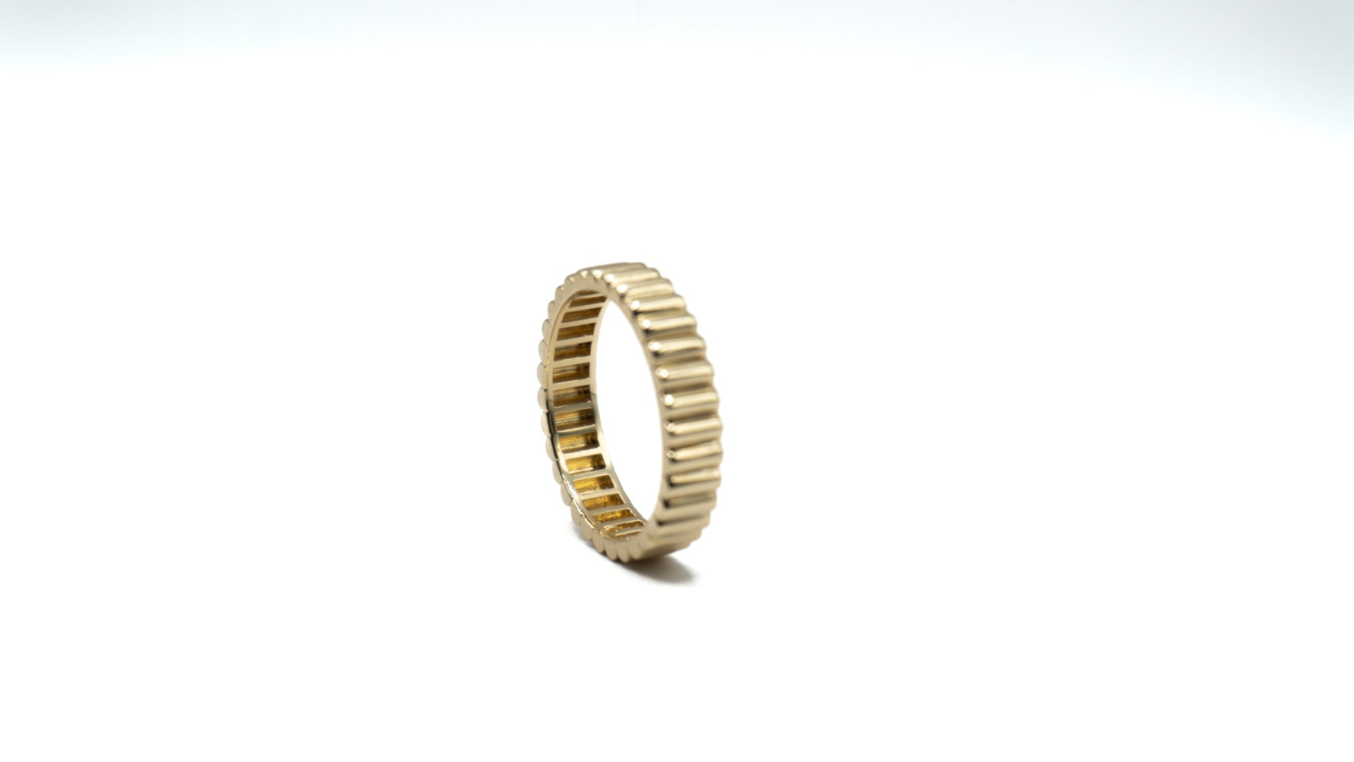 Inspired by golden rays, the Soleil Ring features a bold pattern of vertical grooves that catch and reflect the light from every angle. It’s a radiant statement of strength and style—perfect worn solo or stacked for texture.