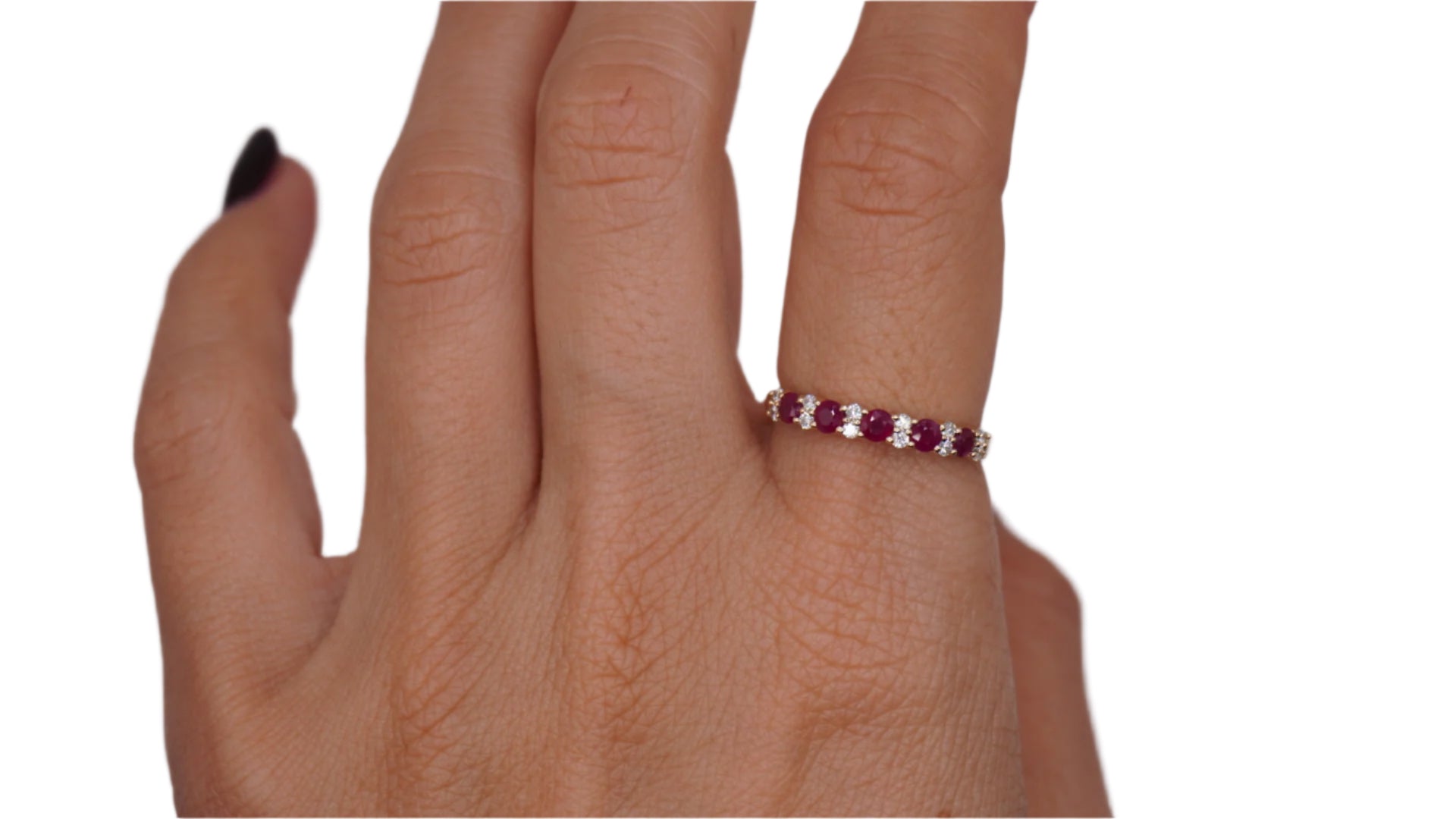 A vibrant symbol of passion and elegance. This 14k yellow gold band features alternating rubies and diamonds in a timeless setting. Perfect as a romantic statement or a luxurious addition to your ring stack.